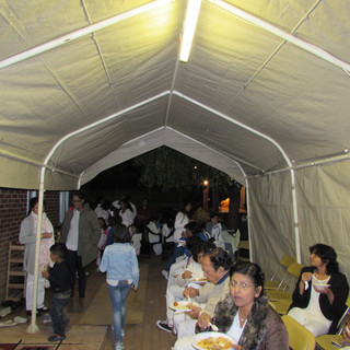 Subsequently a member of laity formally welcomed the monks with a tray of areca nuts and betel leaves to begin chanting. Ven. Gnanissara Thero accepted them conferring with the host monks reciting a Pali stanza constituting an invitation to rest of the participating monks to begin the ceremony. Consequently ceremonial drumming began and oil lamps were lit to invite the gods and deities to the mandapaya. The chanting commenced with the recital of the Maha Piritha by all the monks. At the end of this session devotees were served with refreshments and dinner arranged at a tent adjacent to the dhamma hall while the second session continued with the chanting of Ratana Piritha by two senior monks, seated on the central chairs. Monks chanted in relay, taking turns and the chanting continued without any disruption.